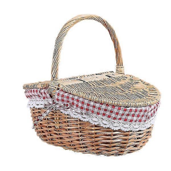 ] Non-toxic and environmentally friendly, safe and durable for long service life. Comfortable carrying handle makes it easier to carry and enjoy your happy picnic. [Double lid] With a high carrying handle, round and comfortable to grip without pain. Double lid makes it more convenient to put in or take out food, fruit or other things. [Removable lining] Removable cotton lining is thick cotton canvas which is sturdy, soft and easy to clean, simple and comfortable, beautiful and practical decorative picnic basket. [Elegant design] The oval storage basket has a beautiful appearance. Attractive wicker baskets combined with linen cotton bring a beautiful elegant look to your room, also a perfect. [Enjoy picnic time] The versatile picnic basket is perfect for picnics, hiking, camping, gatherings, has the capacity for storing food, wine and enjoy your happy picnic time. This wicker picnic basket is lightweight but durable, is full of British country style. It has exquisite workmanship and lace details, looks very elegant and graceful. Color: Natural wood color Material: Wicker basket, fabric Size: Length: 20cm Width: 15cm Height: 13cm Package Contents: 1 x Picnic Basket (with red checkered cloth) Only the above package contents, others are not included. Note: Light and different displays may cause the color of the item in the picture a little different from the real thing. The measurement allowed error is +/- 1-3cm. DM