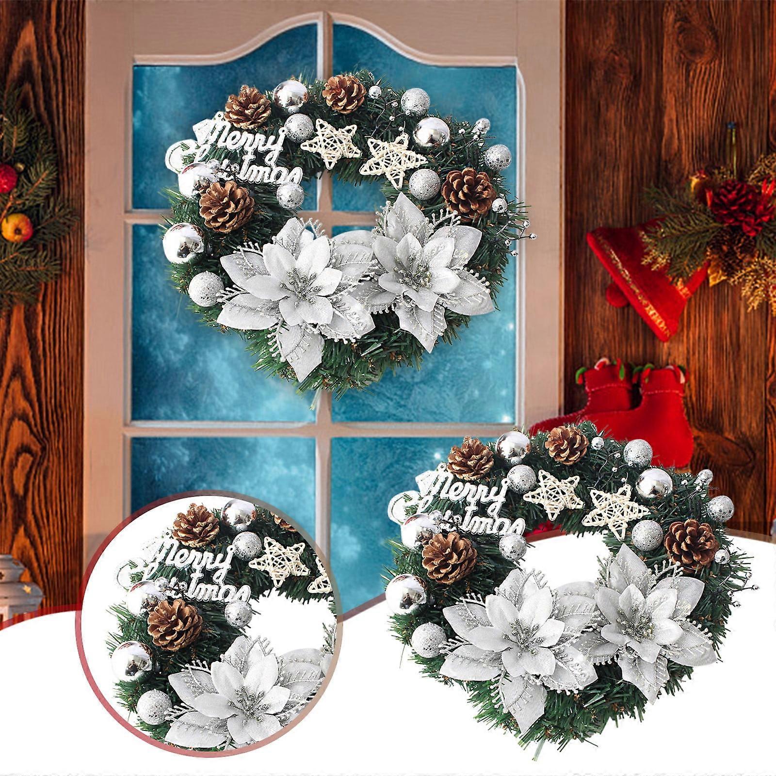 Christmas Wreath with Balls and Plastic Flower, Christmas Garland Winter Holidays Home Front Door Decor Feature: Quantity: 1Pcs Color:Silver Material:plastic Product size:30x30x6cm/11.81x11.81x2.36in Package size: 30x30x8cm/11.81x11.81x3.15in Net weight: 300g/0.66lb Gross weight:400g/0.88lb Descrition: 【 Material】 Our Christmas wreath is made of that is long-lasting and requires no special maintenance, so you can reuse it for years. Decorate your Christmas house or party with this funny and attractive fake Christmas wreath. 【Easy to use】Easy to hang on the front door, back wall, stairs. Let it hang down naturally, very beautiful Christmas decoration. Christmas garland wreath can make your home full of romantic and natural art. Ideal Christmas decorations】Add them to your tree or the sides of your fireplace to add the finishing to your tree decorations. To better enrich any Christmas display. 【Versatile】Perfect indoor and outdoor decoration for Christmas, wedding, home, wall, window, front door, fireplace, living room, bedroom, dining room, porch, etc. It goes perfectly with our red berry Christmas wreath. Show your Christmas spirit. 【Perfect Gift】The front door wreath is the and family. When someone enters your home, there is no better way to greet them than with a beautiful door wreath display. (Due to hand work, the position of the decorative ball is slightly off, but it does not affect the appearance.) you receive the wreath, you need to open it and put it in order, and it will be. Package Content: 1x Christmas Wreath