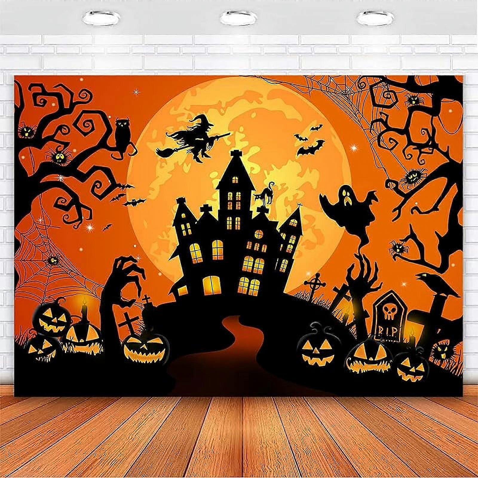Halloween Backdrop 7x5 ft, Horror Moon Night with Haunted Castle, Scary Pumpkins, Witch & Full Moon, Orange - Compatible with Halloween Parties &