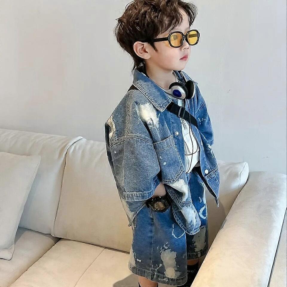 Boys' denim suit 2025 summer outfit new children's short sleeved shirt+shorts 2-piece set kids clothing set