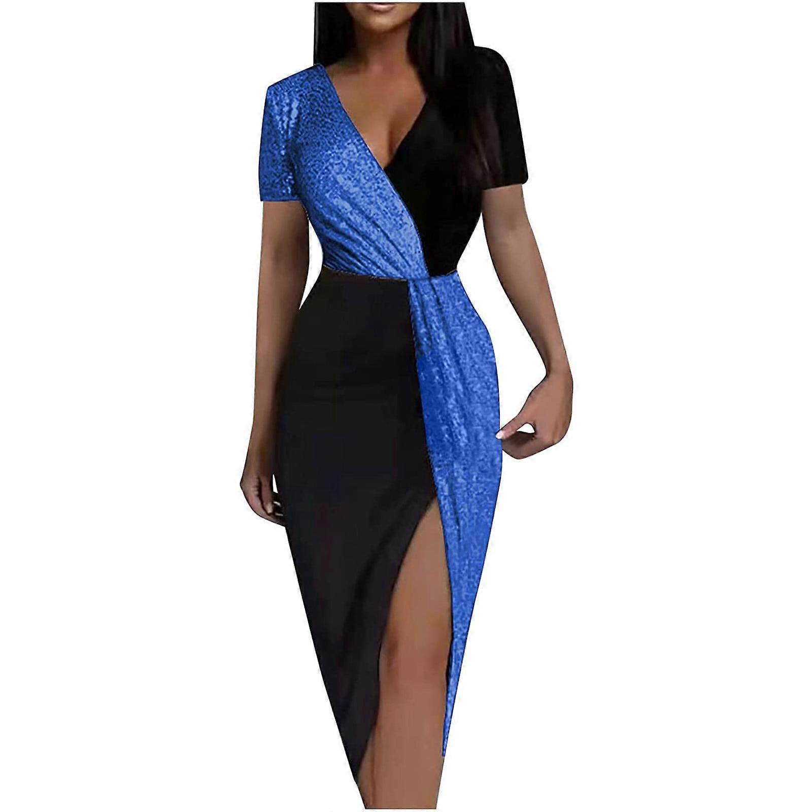 OAVQHLG3B Patchwork Bodycon Dresses for Women Party Night Sexy Midi Short Sleeve High Slit V-neck Casual Cocktail Evening Dress