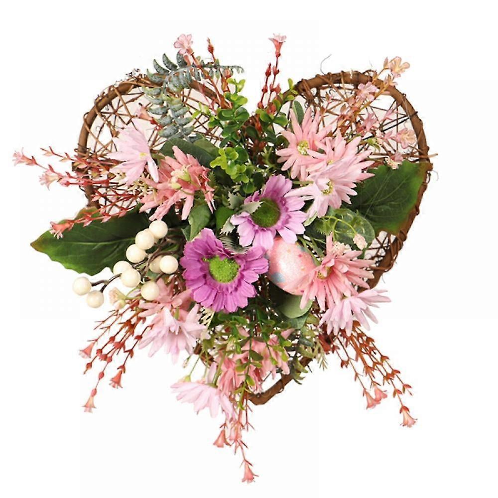 Easter Heart-Shaped Wreath Artificial Peach Heart Rattan Wild Chrysanthemum Wreath with Eggs for Front Door Wall Home