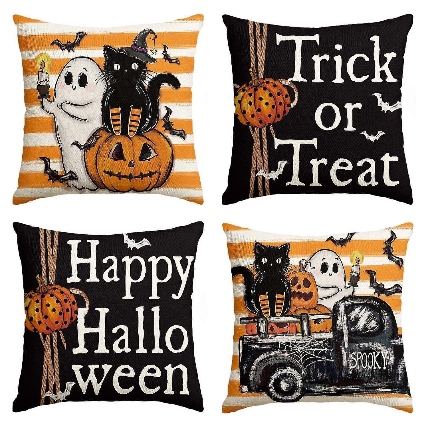 Sm:)e Jack-O'-Lantern Trick or Treat Truck Ghost Happy Halloween Throw Pillow Cover 18 x 18 Inch Striped Decorative Outdoor Cushion Covers Set of 4