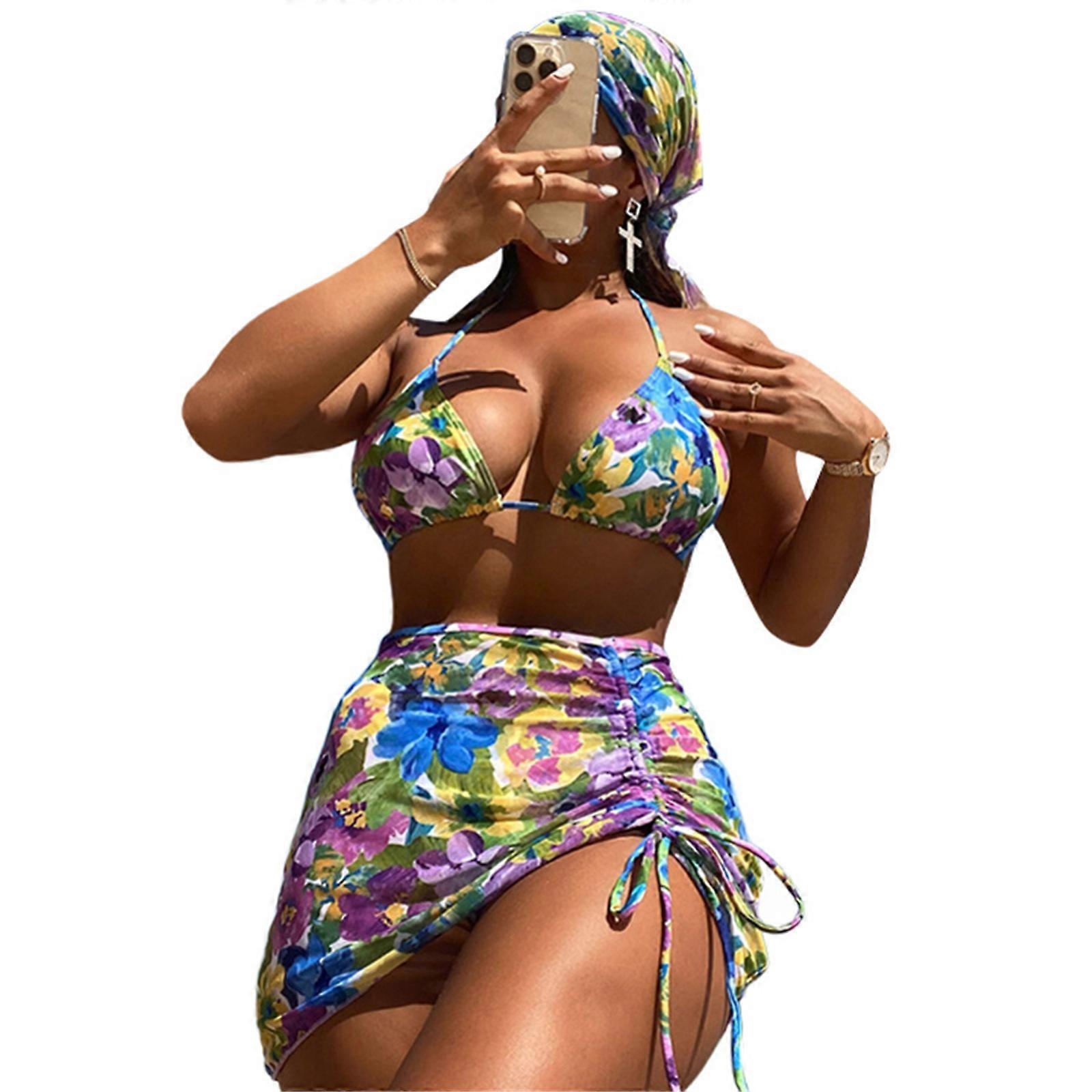 4pieces Floral Print Women Pleated Skirt Halter Bra Thong Headband Set Sexy Beachwear Set Summer Fashion Swimsuit Multi M
