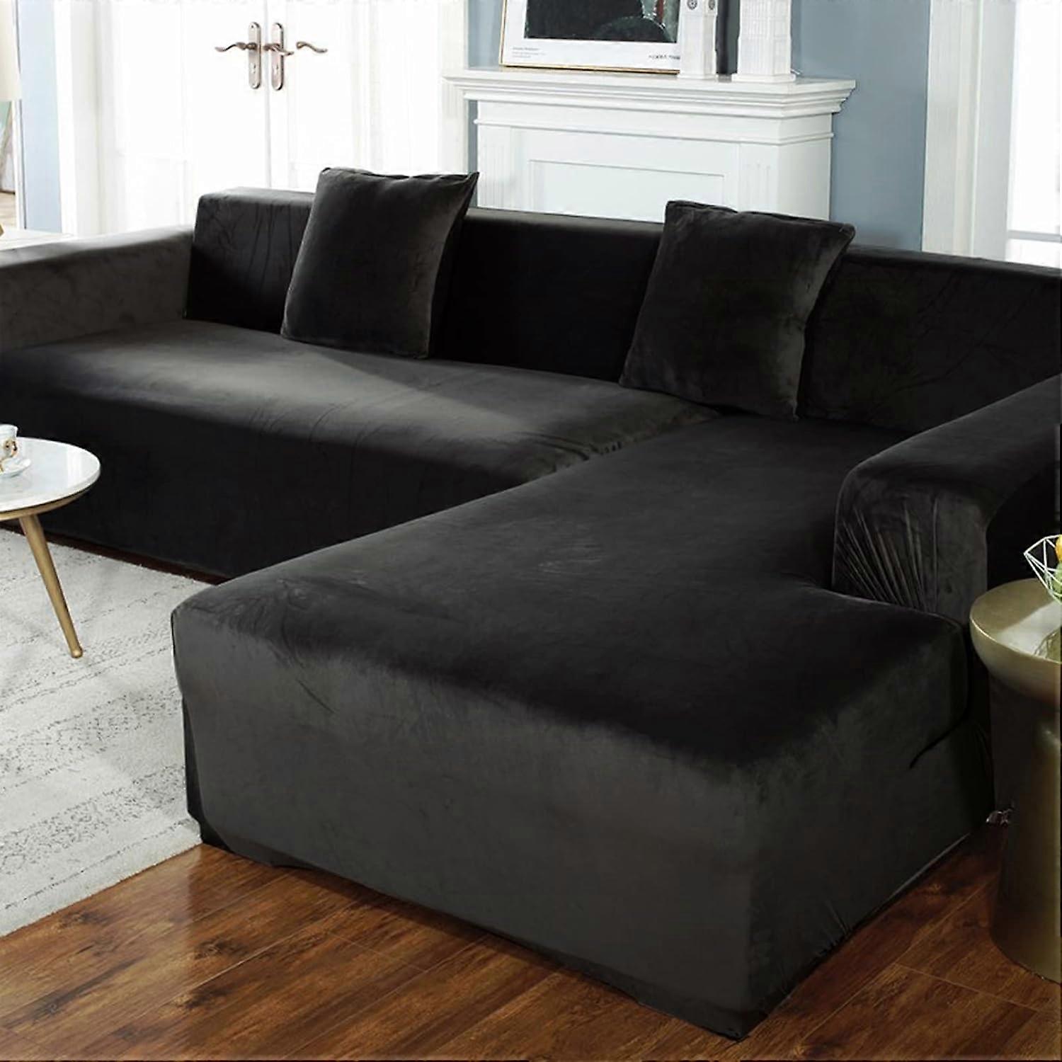 Velvet Sofa Cover for L Shaped Sofa Chaise Lounge Cover,Elastic Sectional Sofa Cover Furniture Slipcover for Pets Kids -black-4seat 235-300CM(92-118