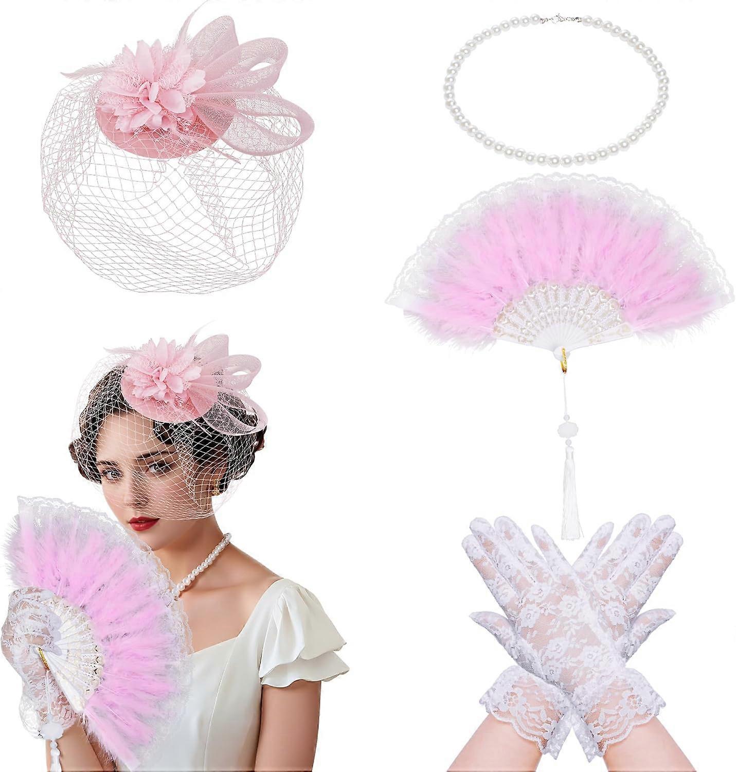 1920s Fascinators Hat with Mesh Veil for Women Veil Feathers Hair Clip Short Lace Gloves Pearl Necklace Feather Fan for Tea Party