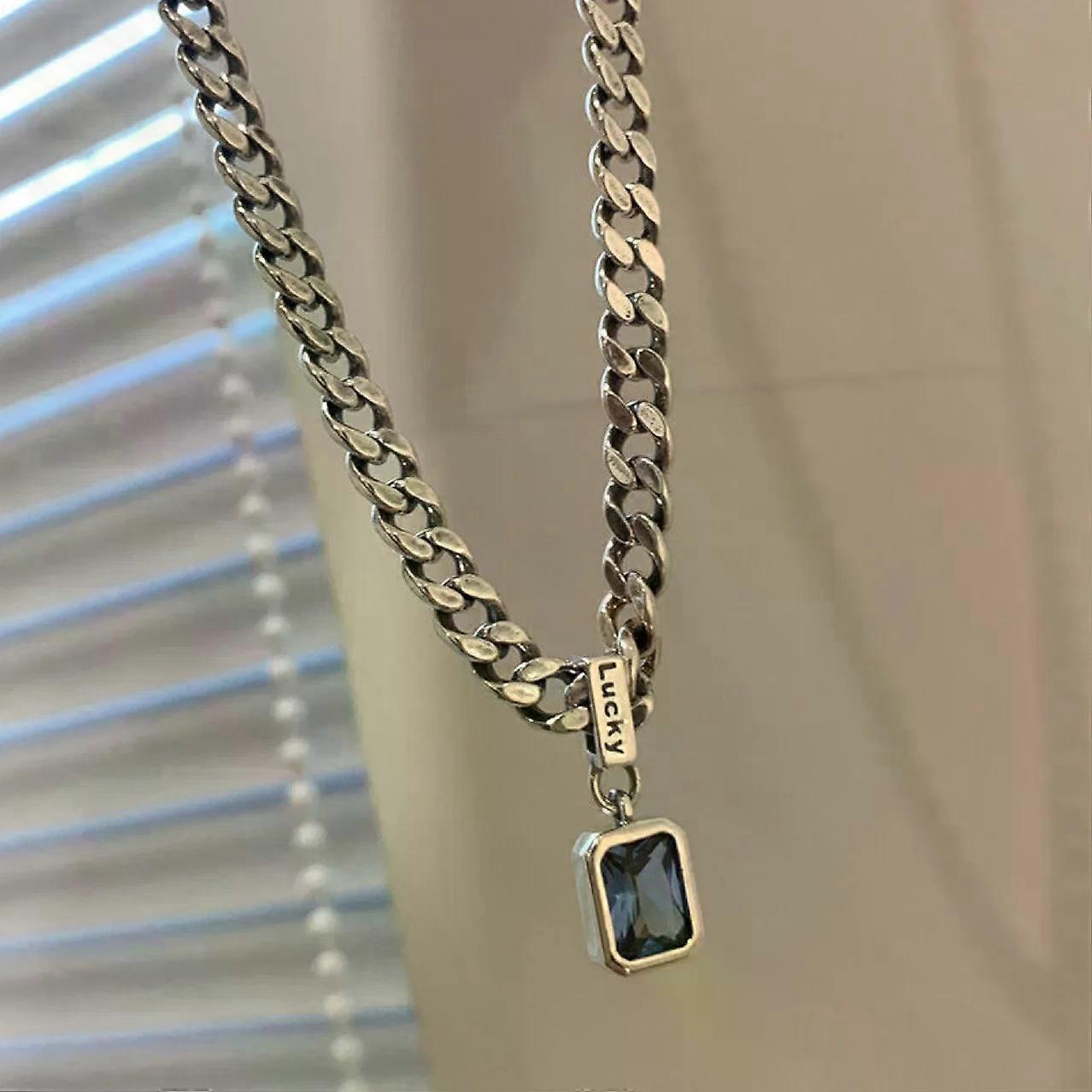 Sea Blue Zircon Pendant Necklaces for Men Boys,Stainless Steel Lucky Words Pendant Collar,Punk Hiphop Jewelry Birthday Gift