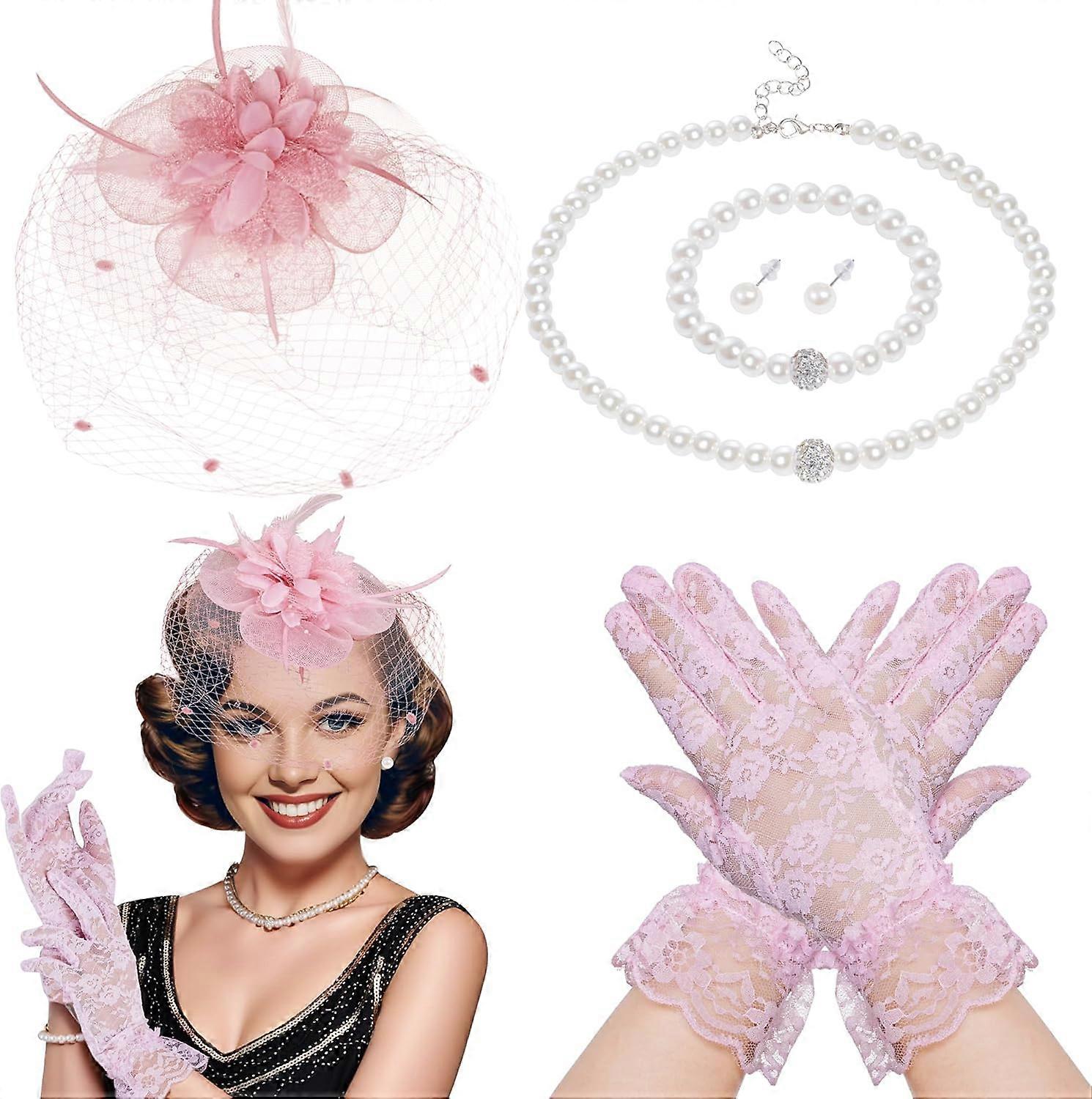 5Pcs Fascinators Hat for Women Tea Party Veil Fascinator Hat Lace Gloves Pearl Necklace Bracelet Earrings for Cocktail Wedding Vintage 1920s 50s Cost