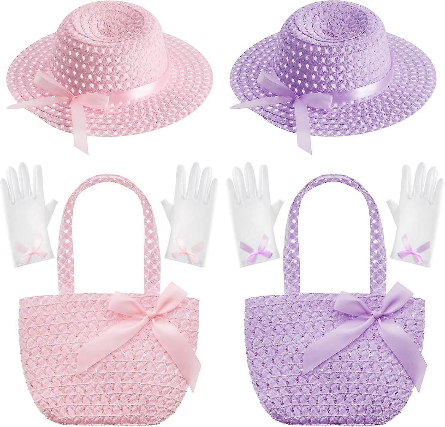 6 Pieces Girls Tea Party Hats Bonnets Set Including Tea Party Hats Purse and Gloves with Bowknot (Pink, Purple)