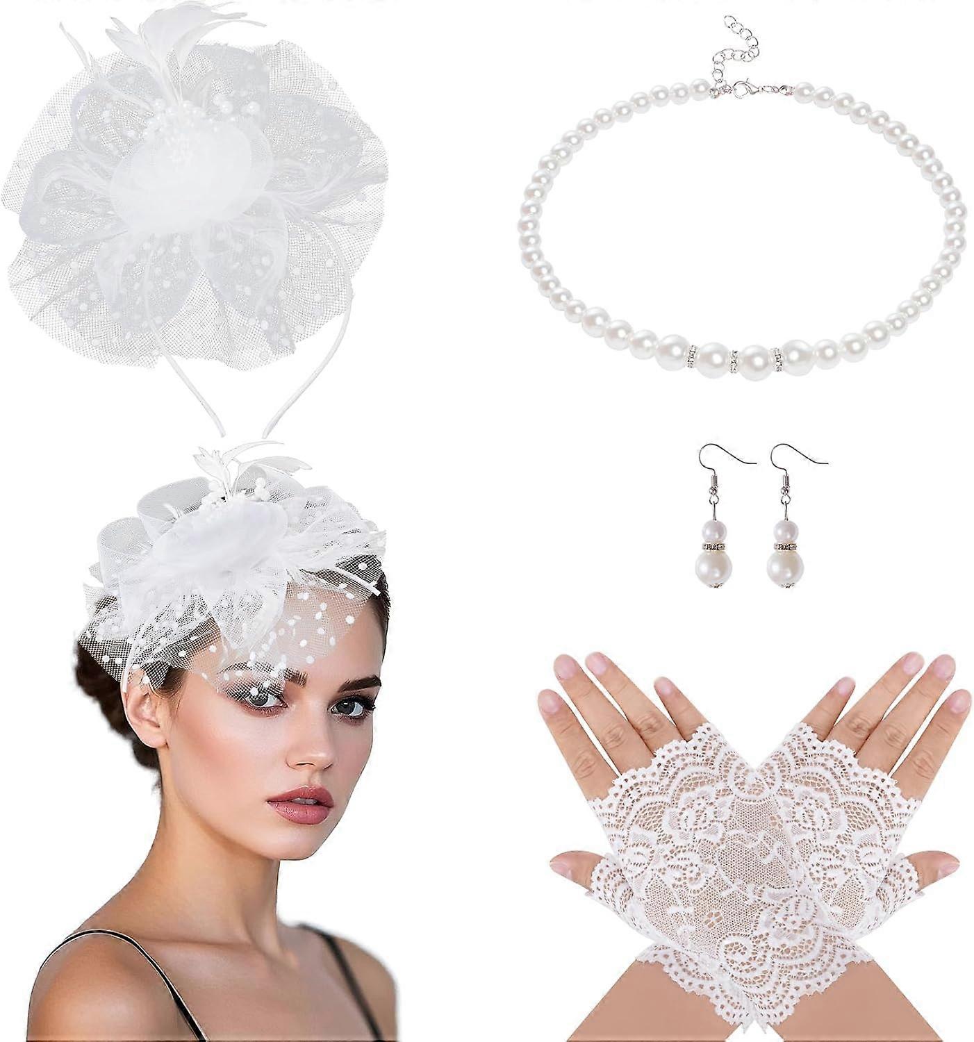 Fascinators Hat for Women Tea Party Veil Mesh Headband Feather Hat Half Lace Gloves Pearl Jewelry Set White Medium