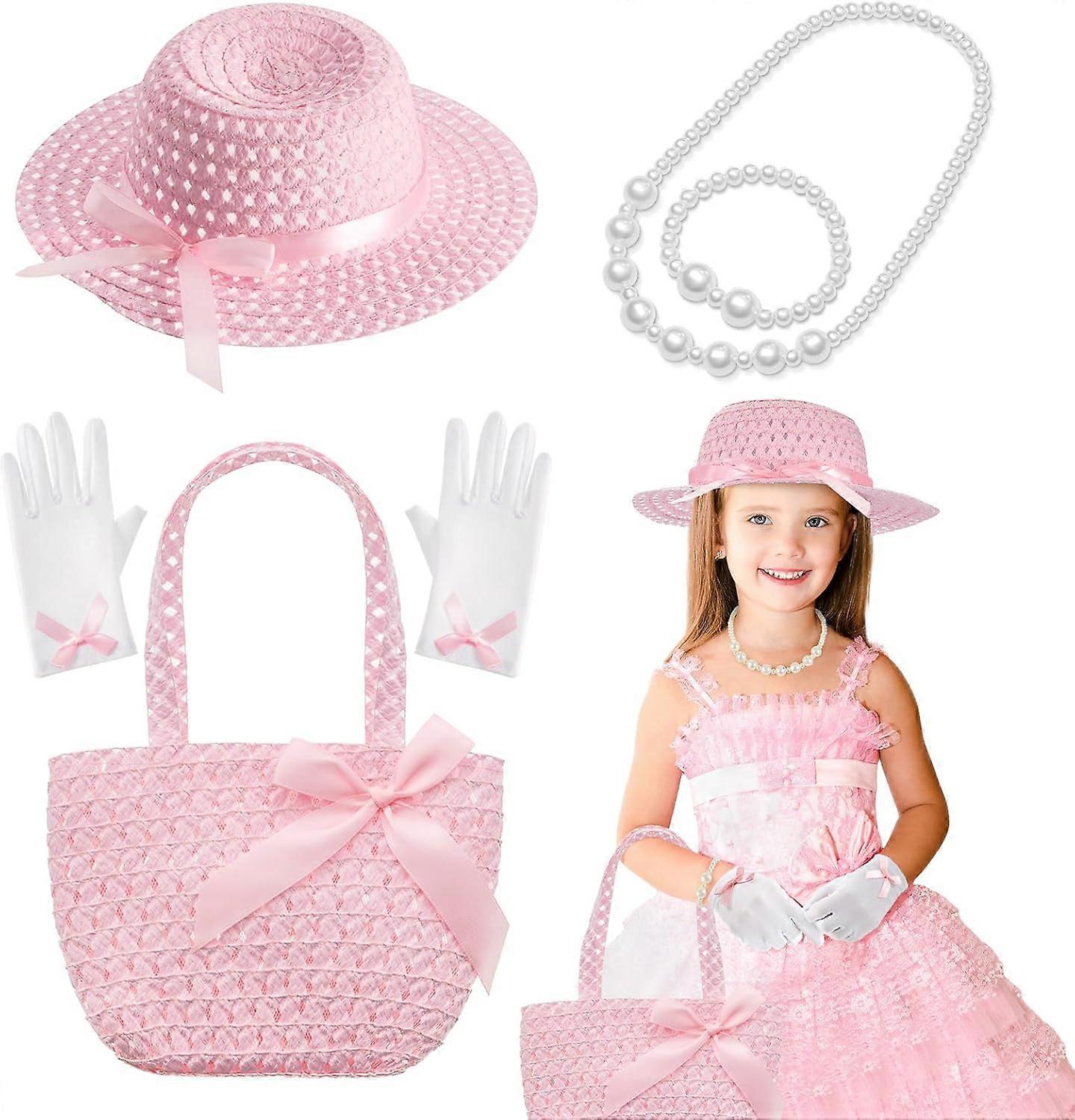 5 Pcs Tea Party Hats Accessories for Girls Including Tea Party Bonnets Sunhats Gloves Handbag Bracelet Necklace Set Pink