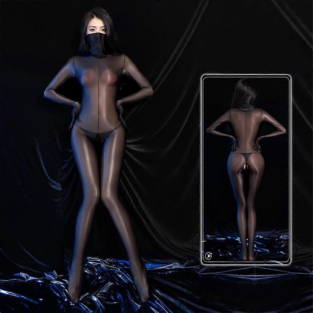 Women Sheer Shiny Glossy Catsuit Bodysuit Full Bodystocking Mask & Gloves Tights