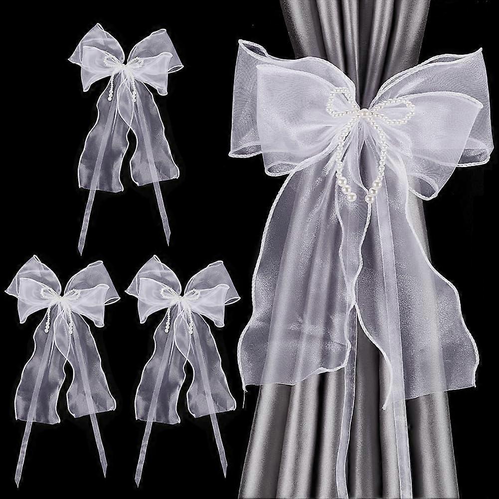 4 PCS Bow Curtain Tiebacks 19.9x9.3inches White Bowknot Pearl Curtain Ties with pin Bowknot Curtain Holdbacks Buckle Lace Bow Curtain Straps