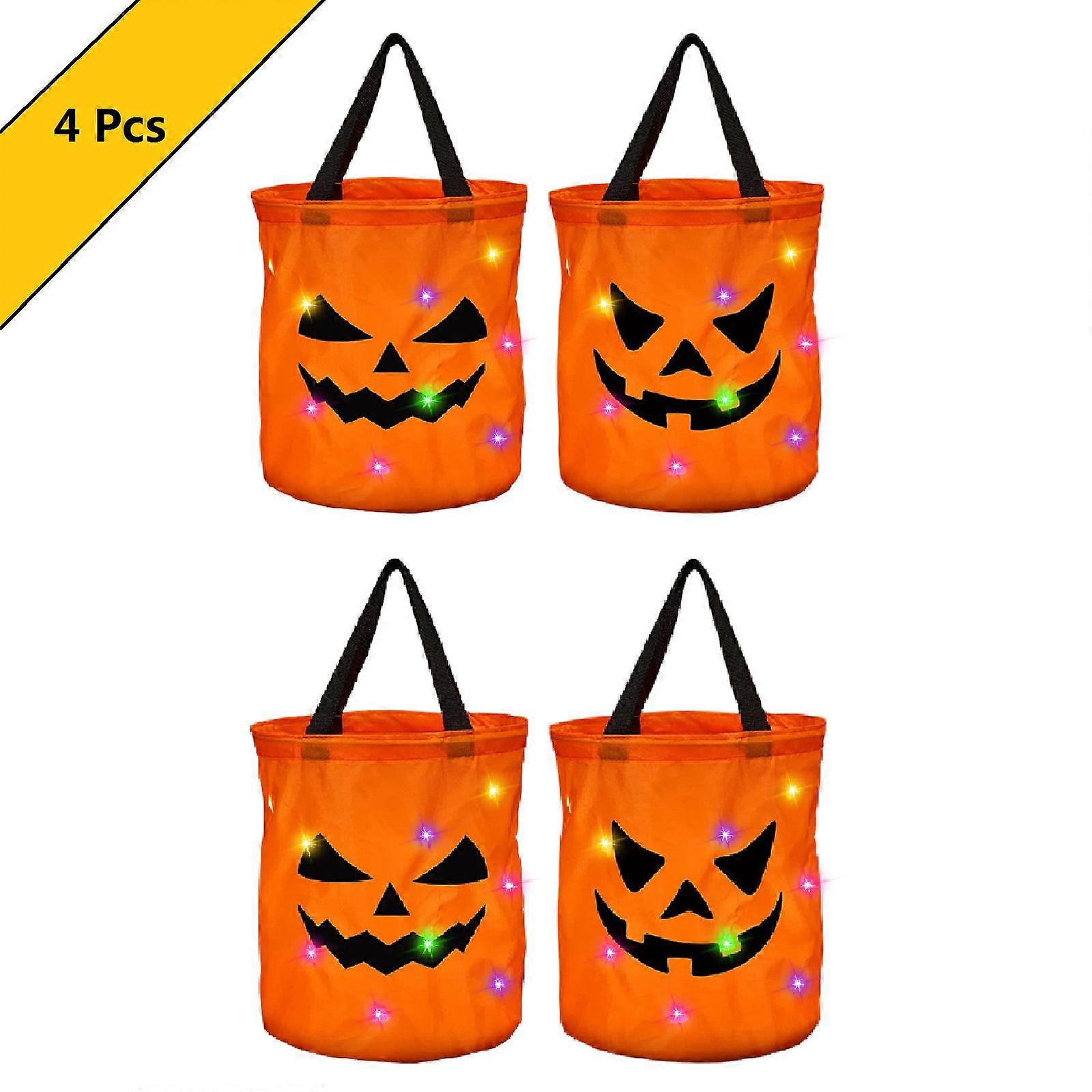 LSLJS Candy Bag, Trick or Treat Bucket, Pumpkin Design with LED Light, Collapsible Ghost Basket for Kids, Birthday Party, Goodie Goody