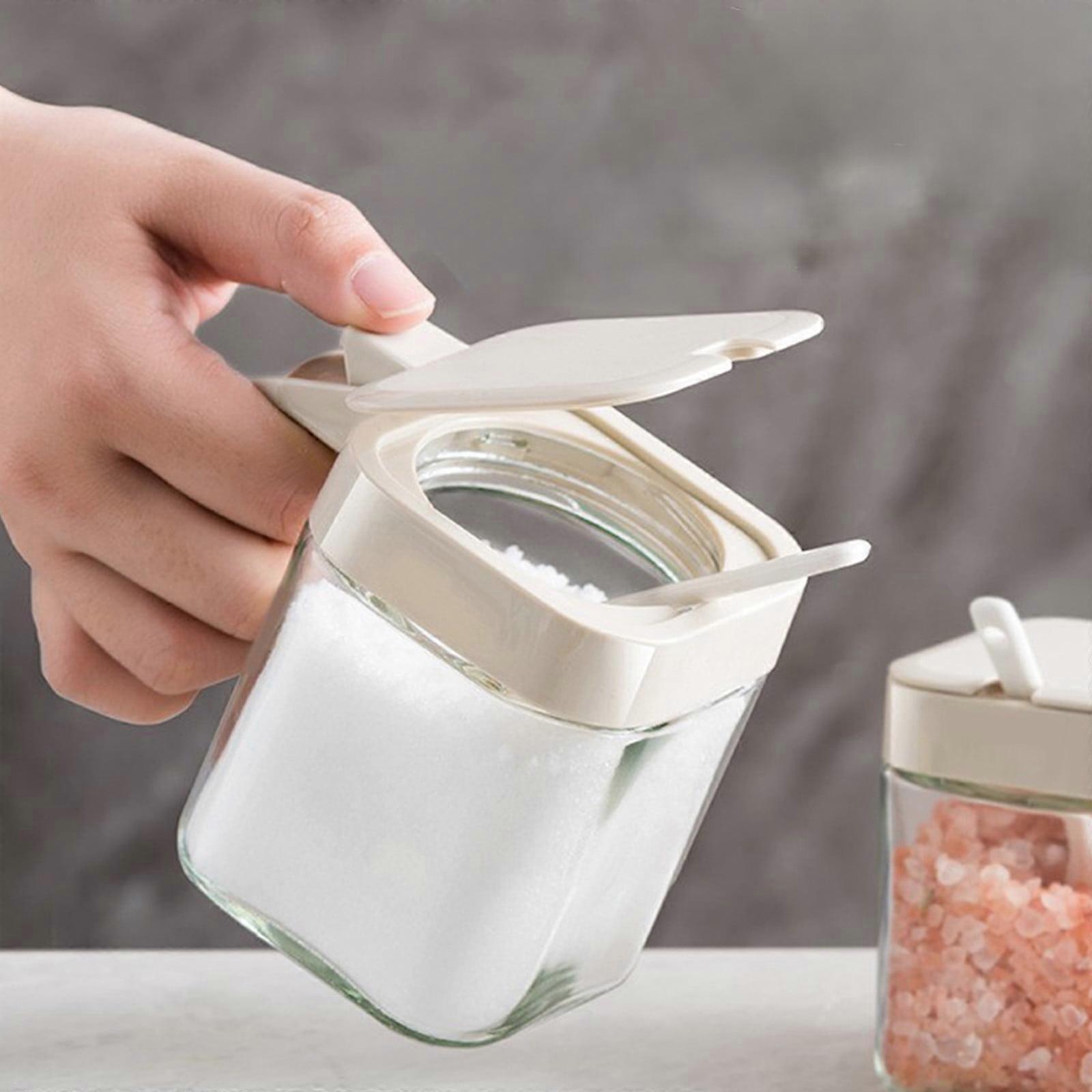 Txmfgh Glass Spice Jar with Spoon Lid, compatible with kitchen & restaurant use, compact, flip top, dishwasher safe, white, 4.33x3.82x2.91 in
