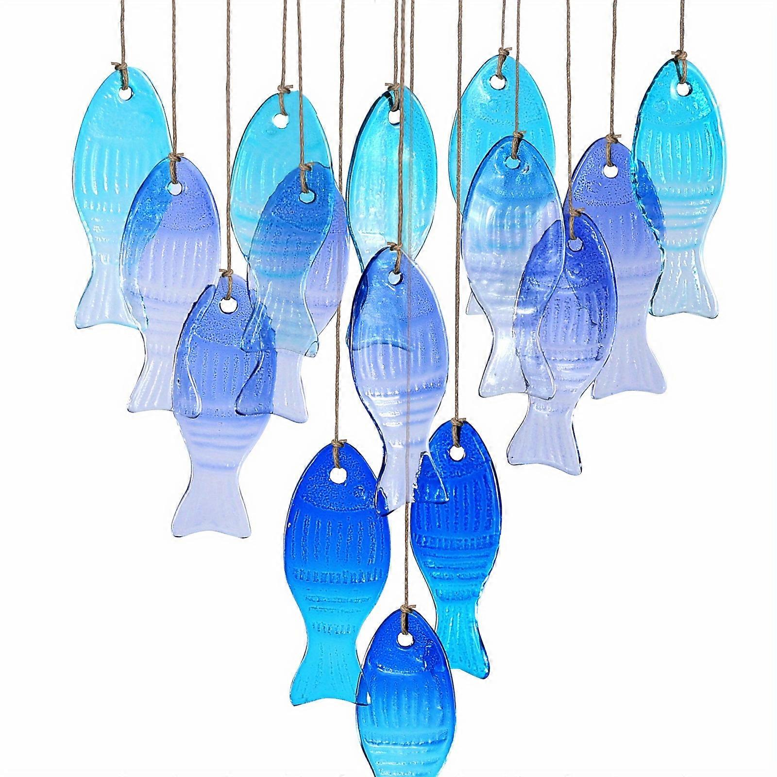 Handmade Blue Glass Fish Wind Chime - Large Outdoor/Indoor Hanging Decor with Vibrant Spherical Fish