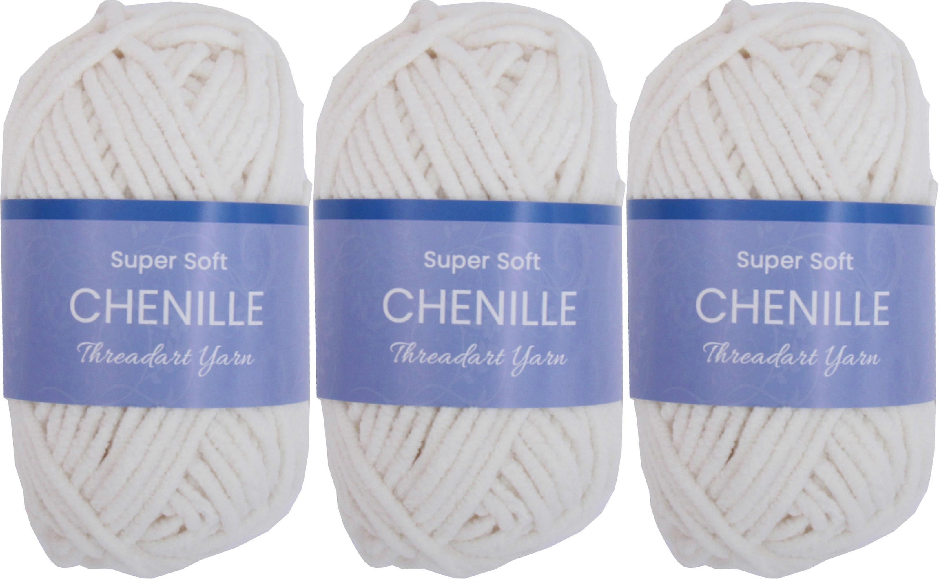 3 Pack ThreadArt Chenille Yarn for Crocheting, Knitting, Amigurumi, Super Soft Plush Velvet Yarn - 50 Gram 60 yds #5 Fluffy Yarn Skeins - Off White