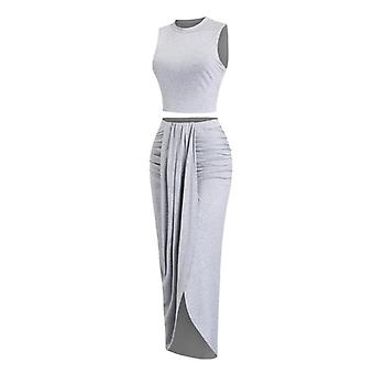 Women's Solid Crop Tank Top & Ruched Asymmetrical Hem Split Skirt Set, Casual Mock Neck Sleeveless Top & High Waist Wrap Skirt,, Cute Summer