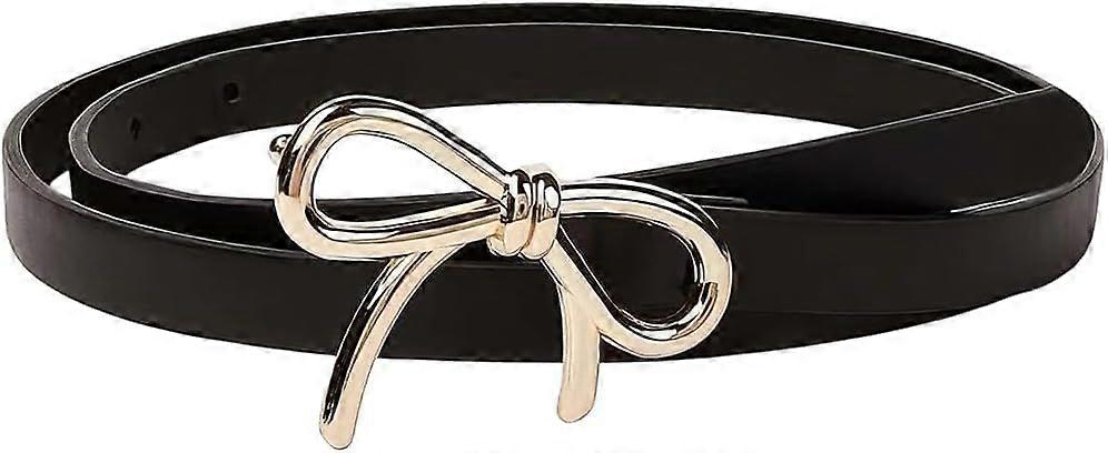 0.5 Inch Width Thin Black PU Leather Belt for Women Adjustable Bow Skinny Waist Belt with Gold Alloy Bowknot Buckle Elegantes Slim Leather Waist Strap