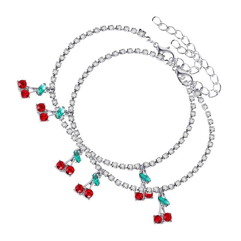 Cherry Rhinestone Anklet 2Pcs for Women Adjustable Beach Foot Jewelry Silver