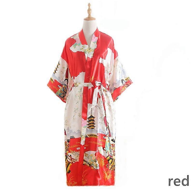 Ladies Faux Silk Long Bathrobe Japanese Kimono Night-robe Nightgown Floral Retro