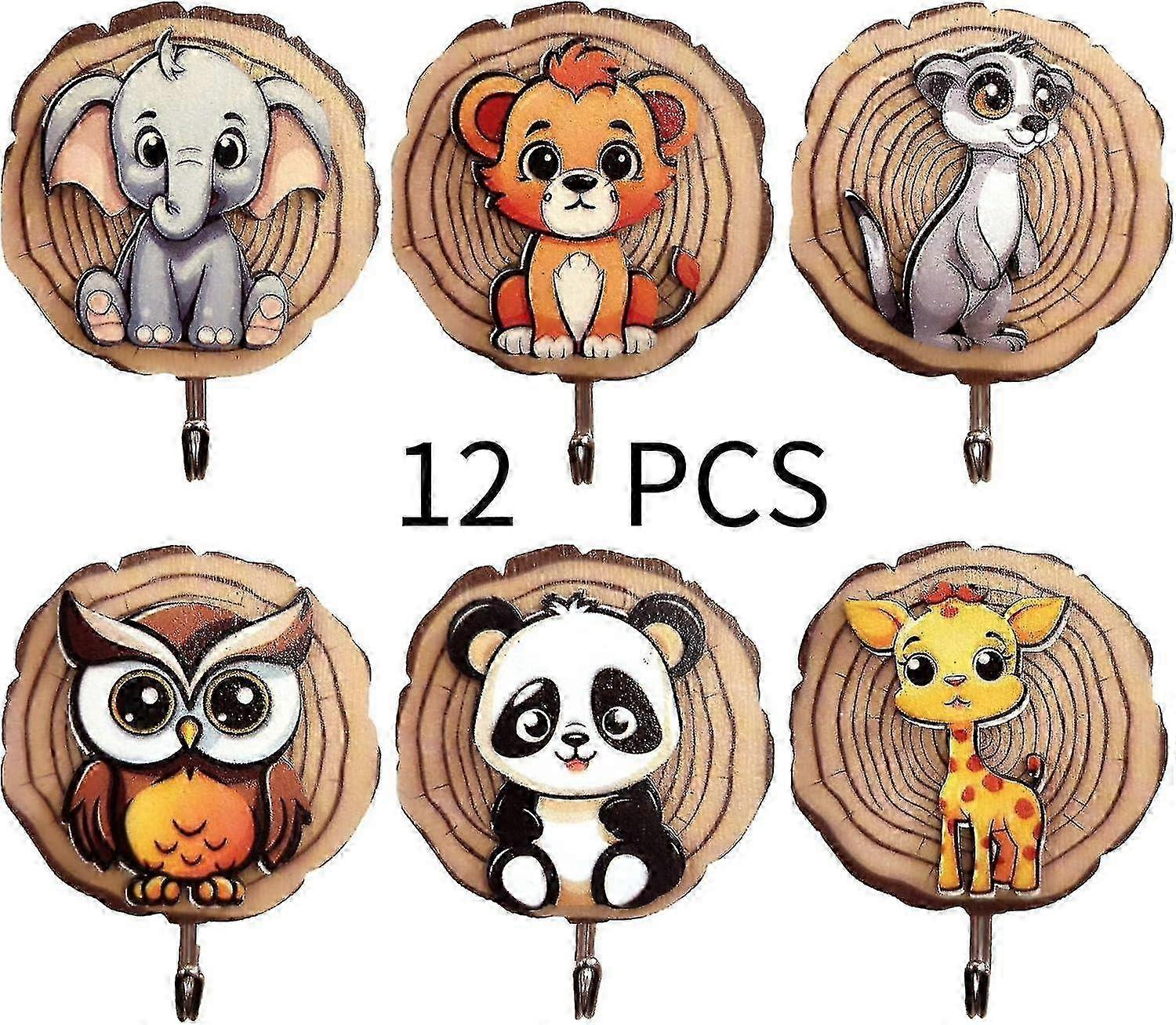 Self-adhesive wall hooks for children, animal-shaped coat racks pack of 6, no drilling required.