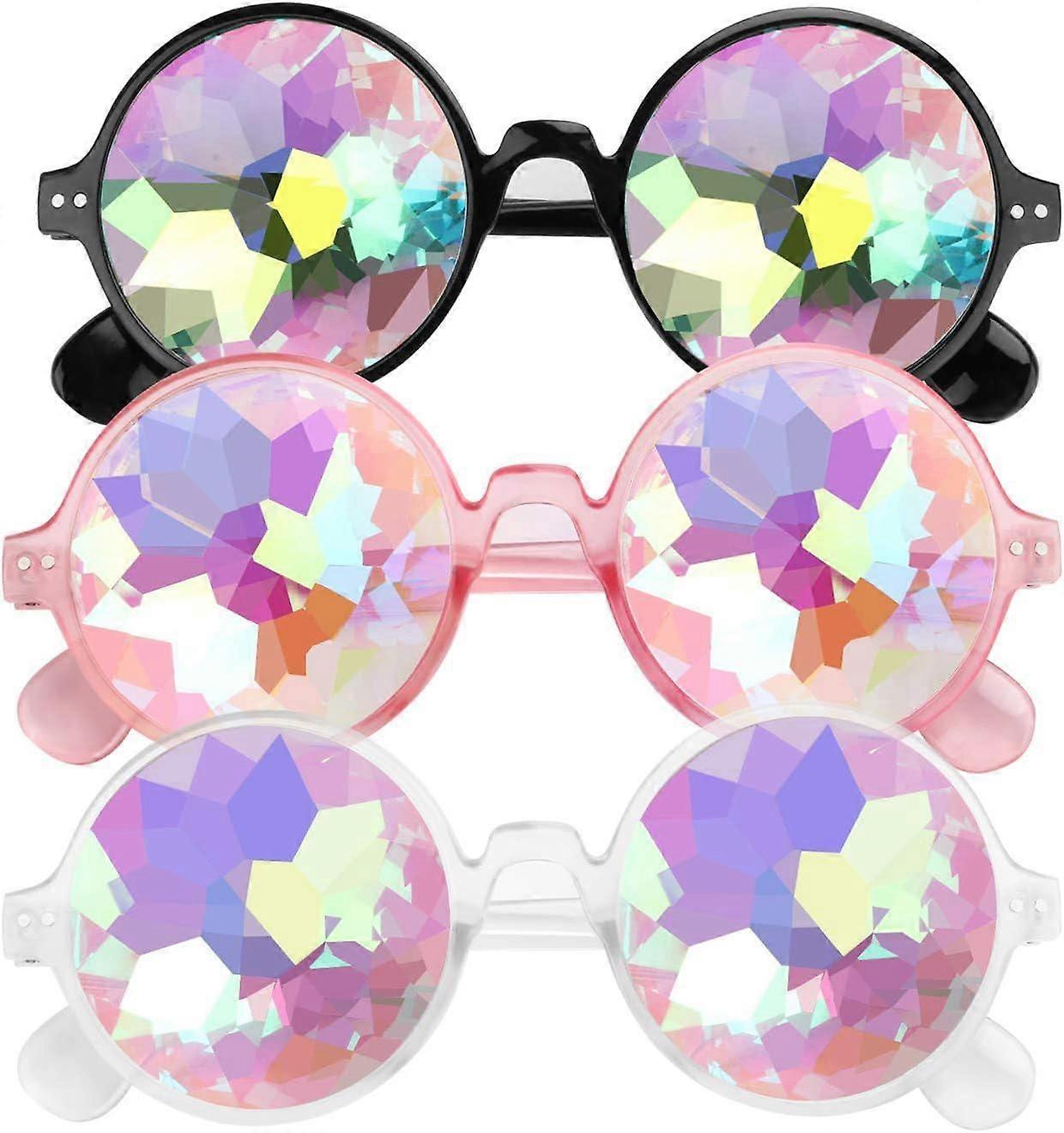 【Package of 3 kaleidoscopic sunglasses】- The package contains 3 kaleidoscopic sunglasses with 3 different bright color frames - pink, black and transparent. The glass crystal lenses provide the wearer with the most psychedelic incredible kaleidoscope effect. Perfect for parties, festivals, light shows and raves.
