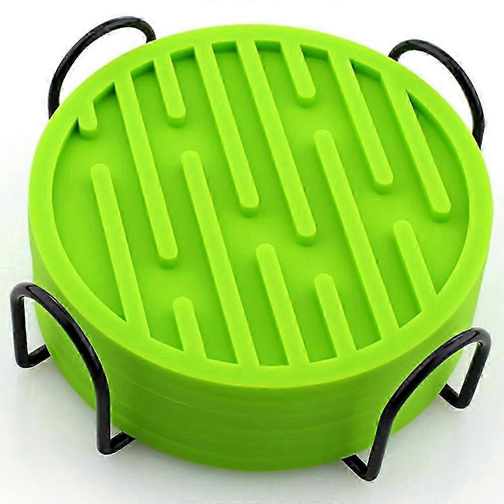 8Pcs Silicone Coasters Set with Metal Holder 10cm Round Draining Heat Resistant Non-Slip MatsStripe GreenGreen Edition 1210