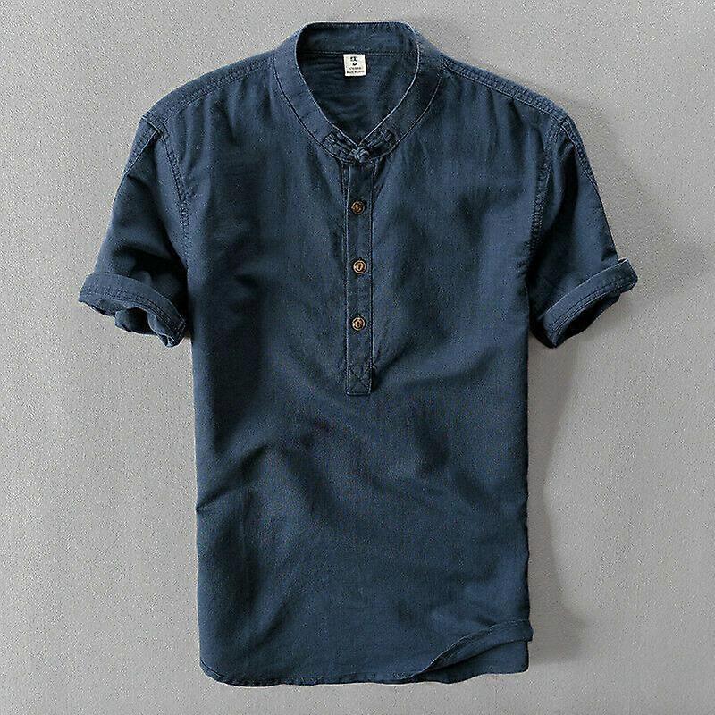 Mens Linen Cotton T-shirt Henley Button Neck Grandad Tops Tee Shirt Short Sleeve