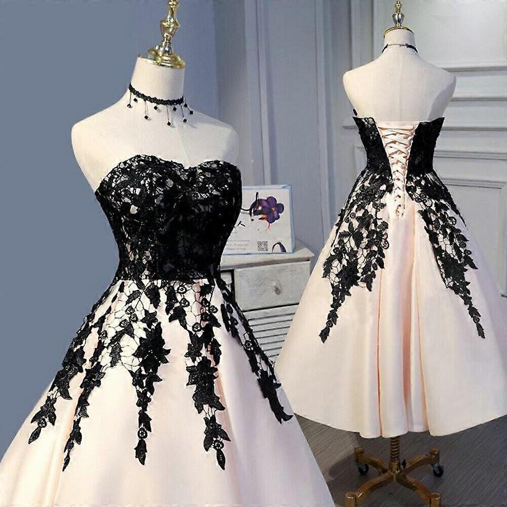 Short Wedding Dress Satin Black Lace Applique Sweetheart Tea Length Bridal Gowns