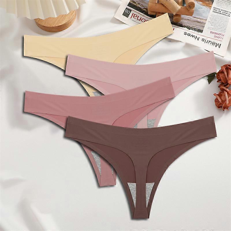 FINETOO 4PCS Silk Satin Seamless Underwear Low Waist Thongs Sexy Solid Color Bikini Underpants Female Stretch Intimates Lingerie