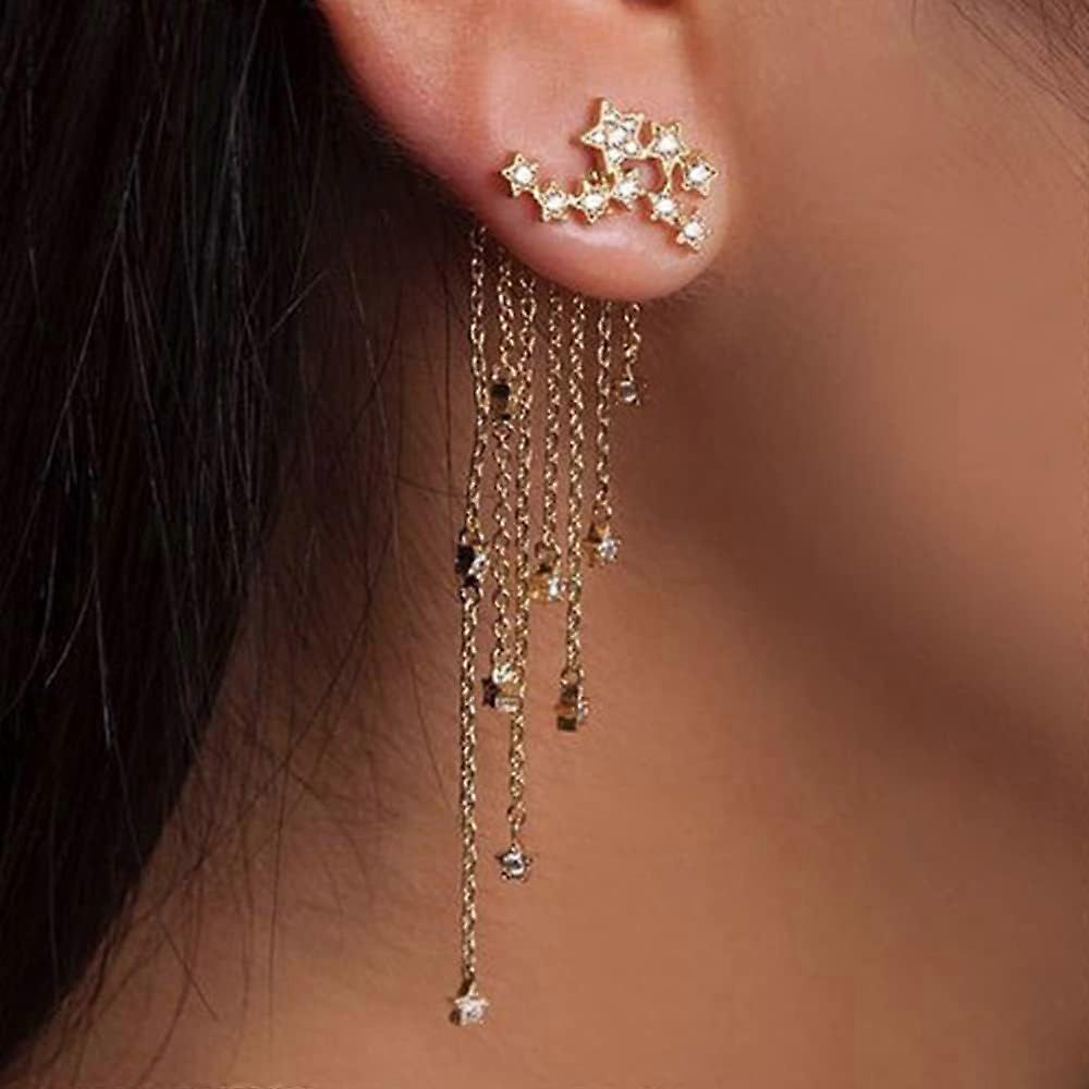 Women Bridal Vintage Star Long Tassels Rhinestones Shiny Stud Dangle Earrings