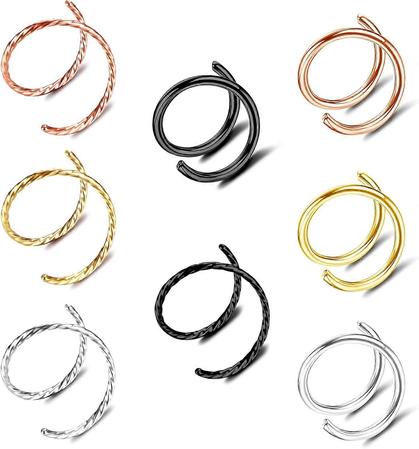 Gift Perfect gift for your lovers, girlfriends, wife, daughter, son, mother, father, friends on birthday, anniversary, Mother's Day, Father's Day, party, Thanksgiving Day and ChristmasSize 6mm double nose ring, 20g double hoop nose ring. Minimalist double piercing nose ring, light-weight to wearDouble Nose Ring Set 8pcs double hoop nose rings, 2 designs, silver double nose rings, gold double nose rings, rose gold double nose rings and black double nose rings, cute double hoop nose ring for single piercing for women and menQuality Material Double nose ring hoops are made of stainless steel, hypoallergenic, free of lead and nickel, safe for your skinMultiple Uses High polished surface, very smooth and comfortable, can be wear as helix hoop earring, tragus hoop earring, cartilage hoop earring and spiral nose ring double hoop