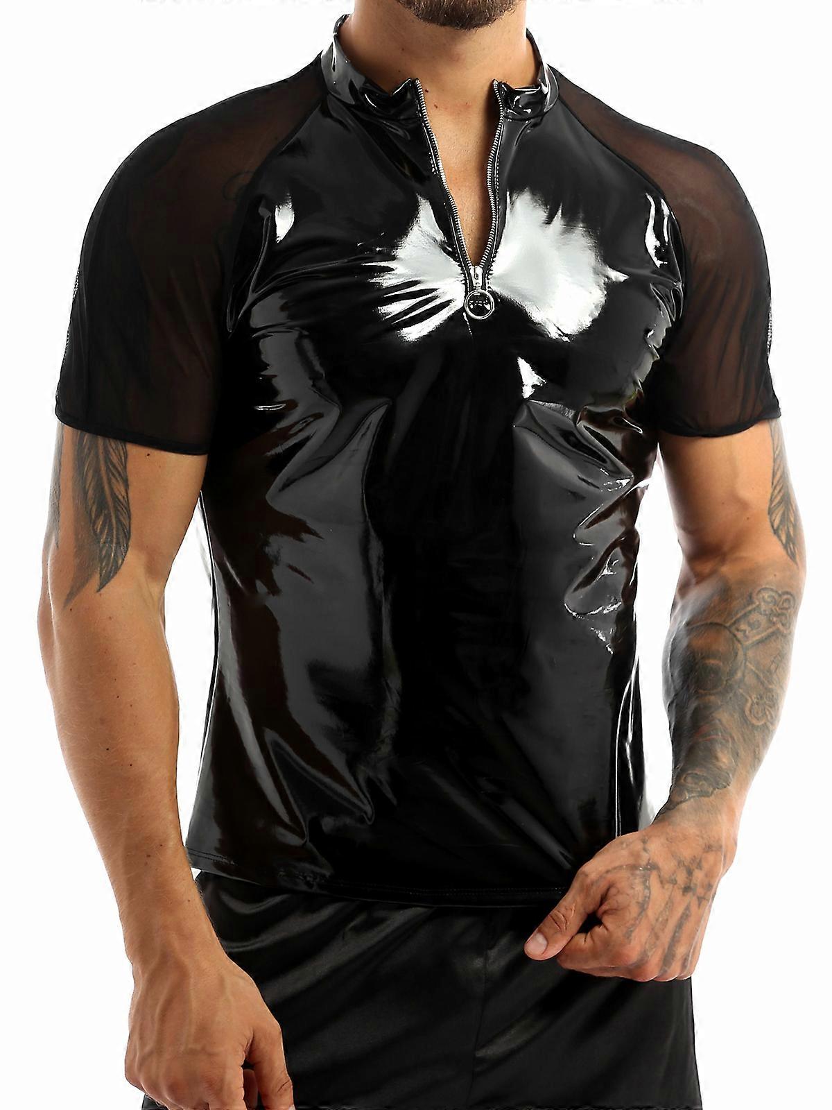 Men's Wet Look PVC Leather Round Neck T-Shirt Short Sleeve Front Zipper Clubwear
