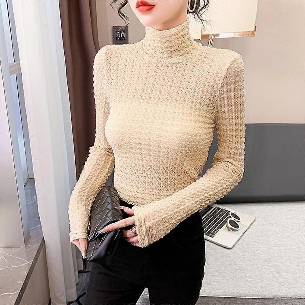 Women Lace Shirt Tops T-shirts High Neck Blouse Long Sleeve Slim Basic Tee Shirt