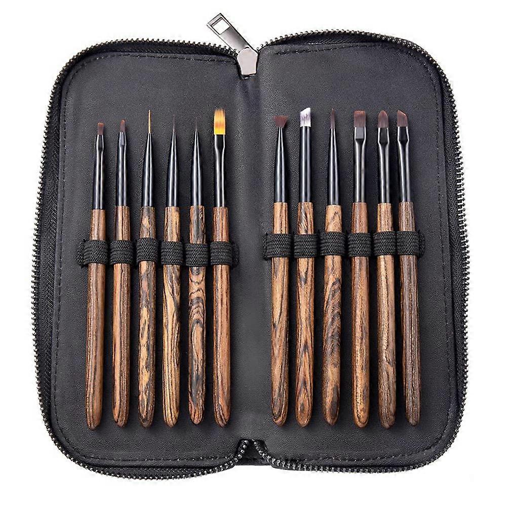 Professional Nail Art Brush Set 12pcs Sandalwood Handle Liner and Dotting Tools with Leather Pouch for Gel Polish Manicure