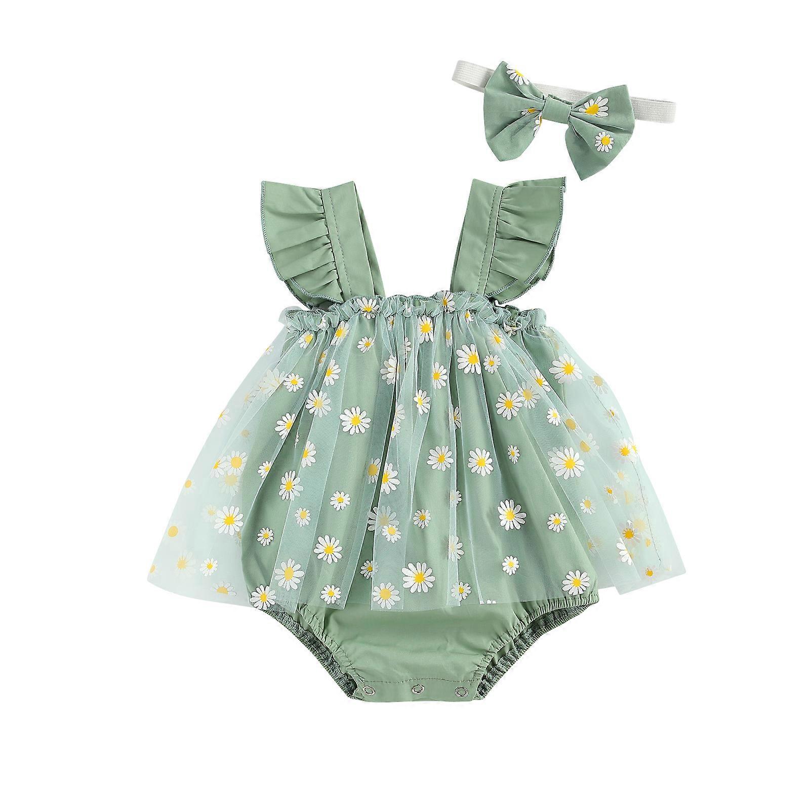 Toddler Baby Daisy Printing Two-pieces Set, Infant Girl's Square Collar Sleeveless Chiffon Bodysuit Skirt + Headband Set