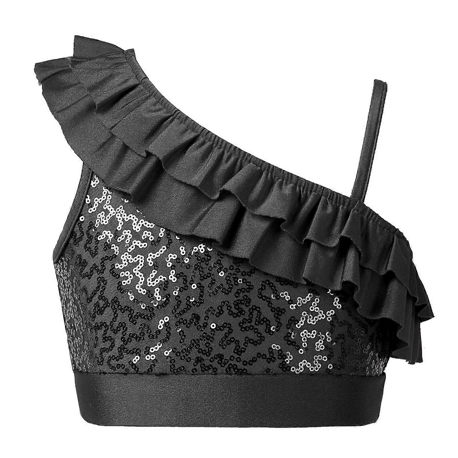 Girls Shiny Sequined Dance Crop Top Asymmetrical Shoulder Straps Jazz Dancewear