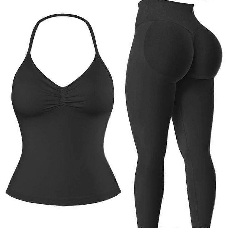 Jetjoy 2 Pieces Workout Sets for Women, Seamless Workout Sets for Women 2 Piece Halter Neck Sport Bra Hidden Scrunch Leggings Yoga Exercise
