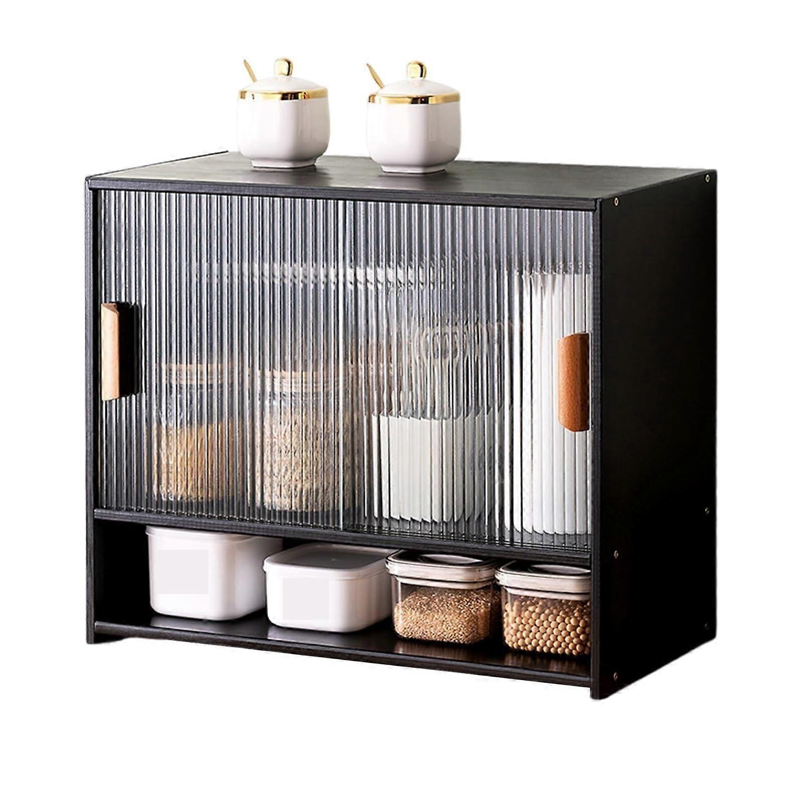 Black Bamboo Kitchen Storage Cabinet with Large Capacity and Acrylic Sliding Door Bread Box