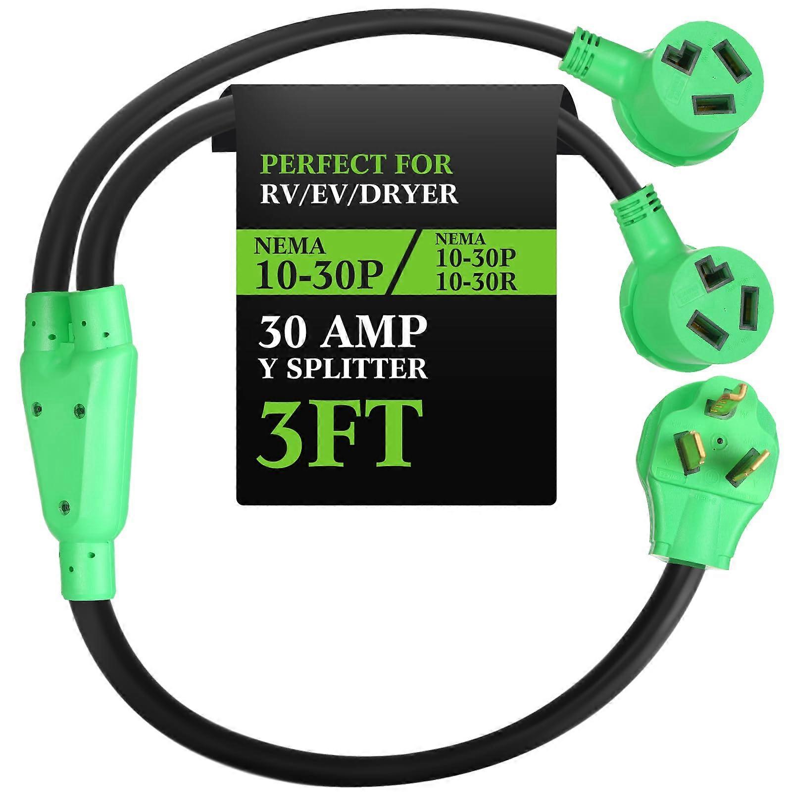 30 Amp Dryer Outlet Splitter NEMA 1030 Compatible Designed for convenience and safety, this quality dryer outlet adapter allows you to split a single NEMA 1030 outlet into two receptacles for versatile use. Key Features and Benefits: Dual Outlet Capability: Easily connect both a dryer and a Level 2 EV charger without the hassle of constantly switching plugs. Ideal for households running both appliances. Note: Use only one device at a time to prevent tripping your circuit breaker. Broad Compatibility: Fits standard 4prong 30 amp NEMA 1030 outlets, featuring one male 1030P plug and two female 1030R receptacles to ensure a secure, compatible fit with your existing equipment. Robust, LongLasting Construction: Built with a molded plug and copper wire coating, this splitter offers conductivity and strength. Flameretardant, UVresistant materials combined with a heavyduty 10 AWG 3conductor design and a weatherproof jacket make it suitable for both indoor and outdoor use. Resists oxidation to extend product life. SafetyOriented Design: The bright green color makes the cable easy to locate in dark or cluttered spaces, reducing the risk of trips or misconnection. for garages, basements, or outdoor charging areas. Practical Applications: 1. Charge your electric vehicle with a Level 2 charger using your laundry room outlet while having the flexibility to quickly reconnect your dryer without rewiring. 2. Power two separate appliances in a workshop from a single existing NEMA 1030 outlet while avoiding downtime caused by plug swapping. 3. Use in a garden shed or outdoor service area where access to multiple devices is needed, and visibility is crucial for safe operation in lowlight conditions. Specifications: Connector Type: 1030P male plug Receptacle Type: 1030R female sockets (2) Amp Rating: 30 Amp Wire Gauge: 10 AWG, 3 conductor Materials: Molded plug, copper wiring, flame retardant and UVresistant insulation, waterproof jacket Suitable for indoor and outdoor use This splitter combines compatibility, durability, and practical design to provide a reliable solution for safely connecting multiple devices to your dryer outlet.