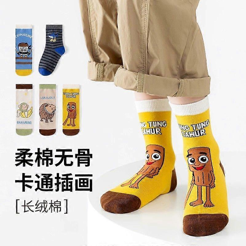5 Pairs Italian Brainrot Children's' Socks Spring Autumn Cotton Socks Kids Striped Pattern Sock 1-14T Boys Mid-calf Length