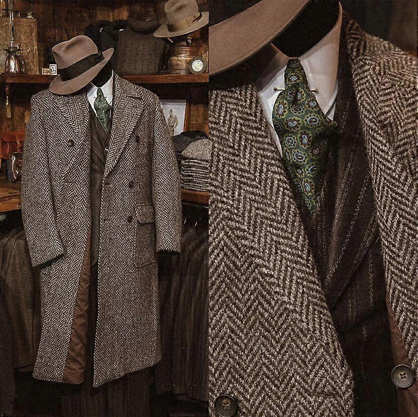 Tweed Men Overcoat Herringbone 100% Cashmere Double Breasted Long Jacket Tuxedos