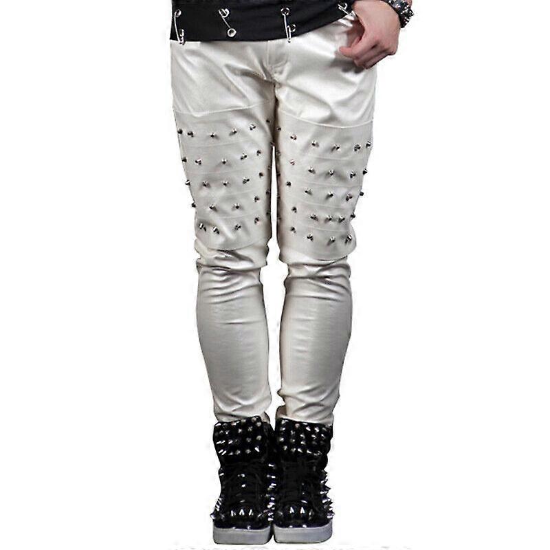 Men Slim Faux Leather Studded Pants Nightclub Trousers Wet Look Showman Costume