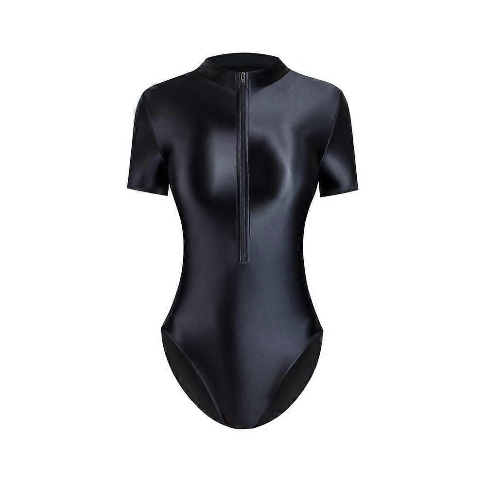 Women Sexy Smooth Short Sleeve Swimwear Front Zipper One Piece Leotard Swimsuit