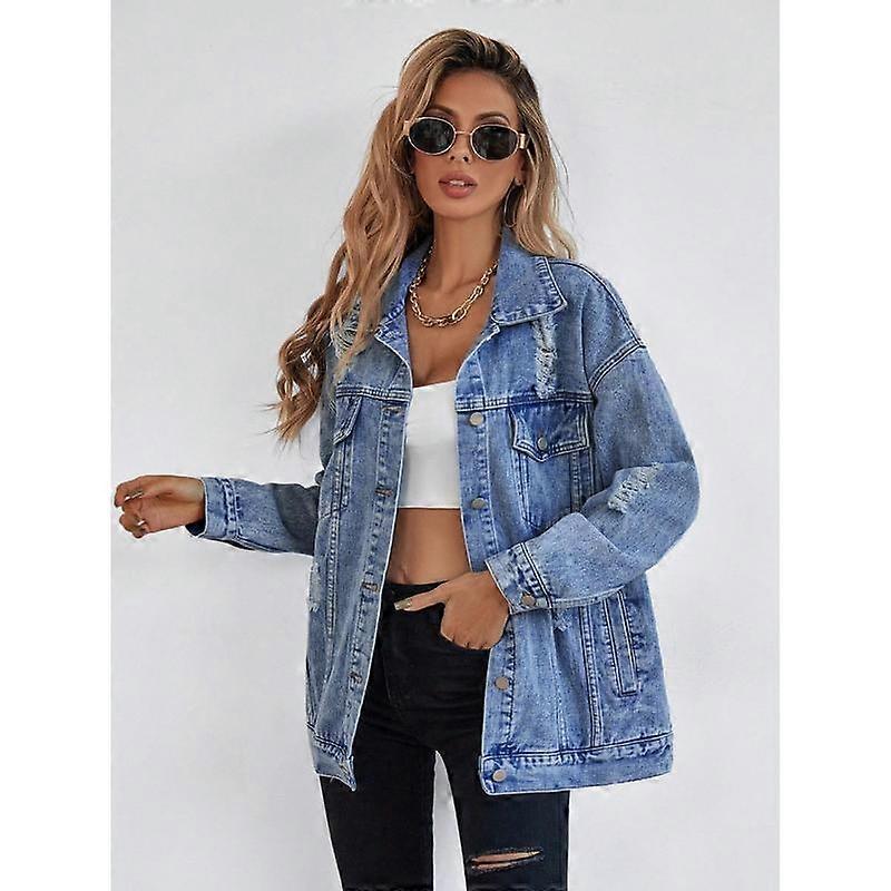 Scacto Jean Jackets for Women Ripped Fringe Denim Jean Jacket Casual Long Sleeve Pockets Jackets Coat Fabric Fashion Womenswear Soft button
