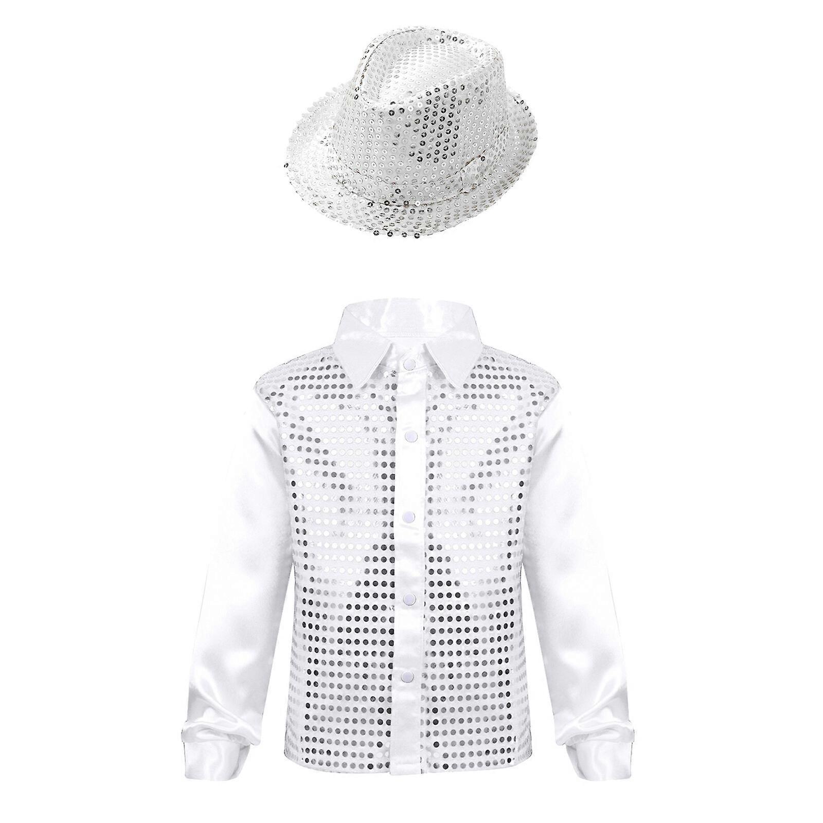 Kids Boys Shirt with Hat for Dance Glittery Sequin Long Sleeve Lapel Collar