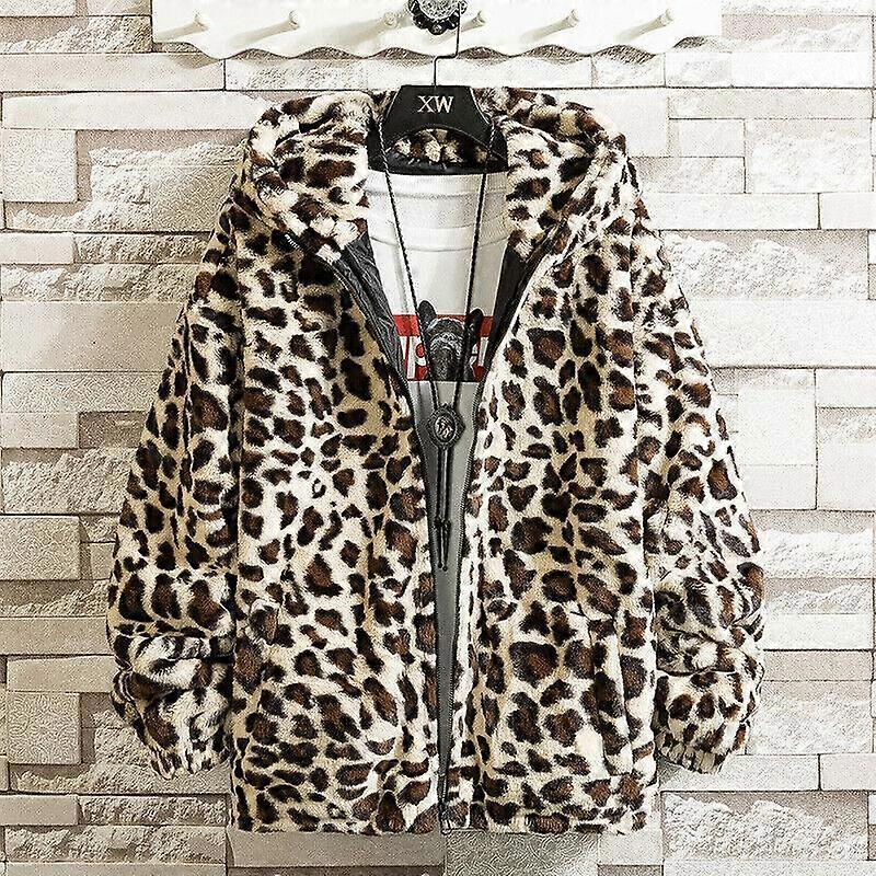 Mens Fashion Youth Leopard Hooded Faux Casual Loose Warm Coat Jacket Outwear