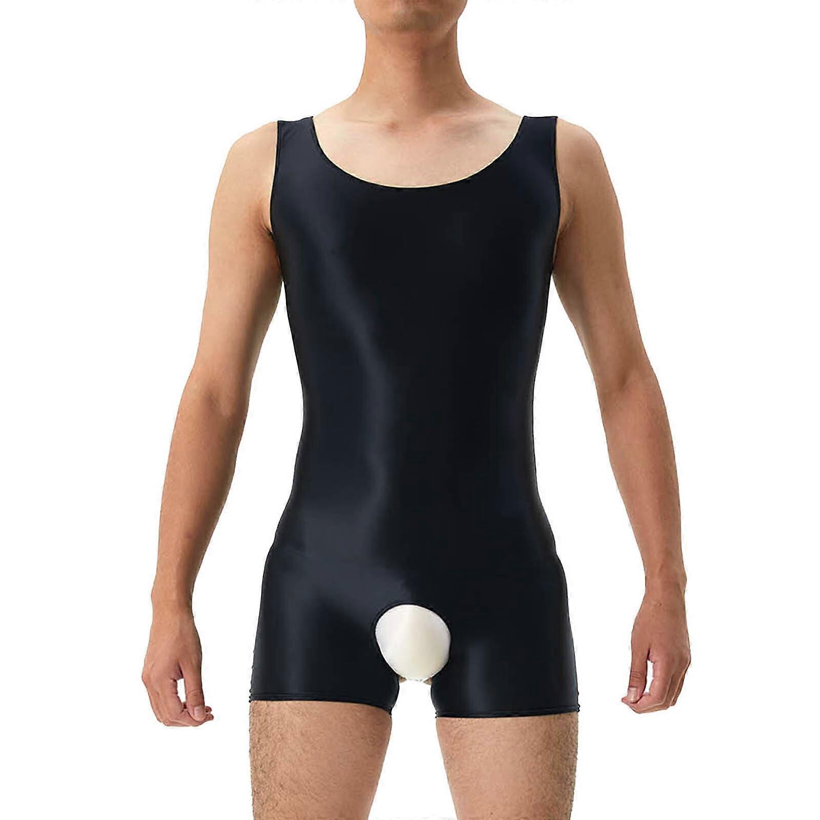 Mens Glossy Underwear Sleeveless Bodysuit Crotchless Leotard Shorts Jumpsuits