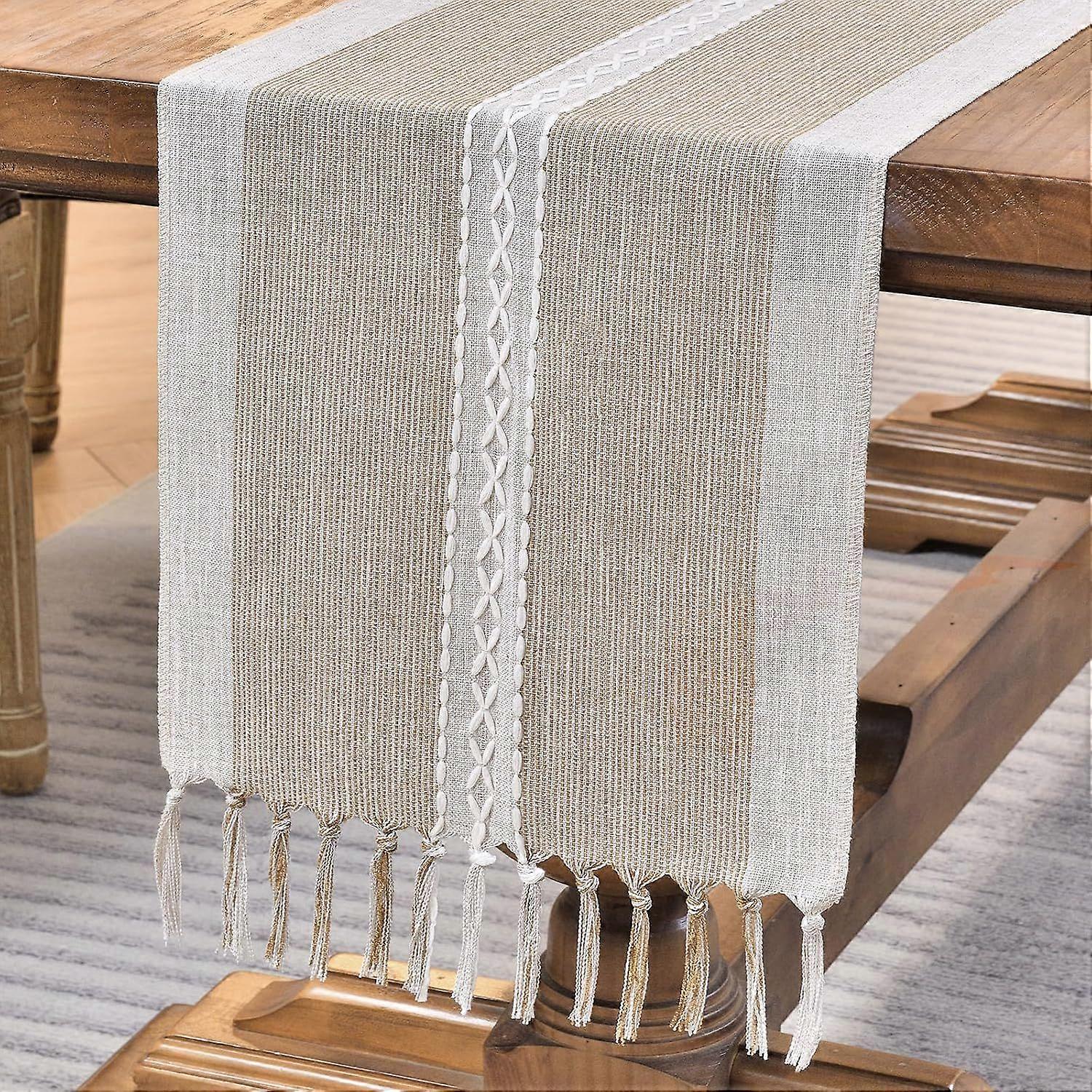 Product care instructions - It's easy care with Machine wash in cold water with a gentle detergent. Do not bleach, dry flat; Low iron as needed.SATISFACTION GUARANTEE - If you are at all unsatisfied with your product, please contact us and we will be happy to assist you.BlendedSize - 36, 72, 90, 108 inch long, the length not included the tassel. You can choose the right size according to the length of your table.Premium Material - Our farmhouse table runners are made of polyester woven fabric, eco-friendly, thick, soft, natural, durable and reusable.Unique Design -A high-end embroidered design with astrong country feel which gives it an elegant and chic charm of the dining table. This farmhouse style table runner is perfect for any occasion.
